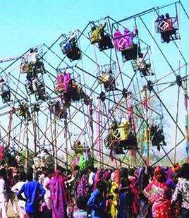 Every group visiting the fair carries its own drum, so that the atmosphere comes alive with a nonstop beat of drumming. The women sing folk songs in shrill choruses, and everyone dances near the main temple. Over a hundred stalls hold food and drink, and sweets of various kinds. Silver ornaments and household items are out for sale. There is also a giant wheel and a merry-go-round. The dancing and drumming continue for hours until everyone is left exhausted.