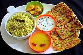 The traditional food of Daman is predominantly vegetarian. The people have a light breakfast with Rotli (flat breads) and tea, while rotla (peasant’s bread) and saag are taken for lunch. Chokha, with saag and curry is taken for dinner. Puri, lapsee, dudhplag etc are prepared during festivities. Aleti Paleti with chicken liver andgizzard, bheja na cutlets, Parsi kheema, boi, batterfried Bombay ducks, akuri are popular Parsibreakfast dishes.