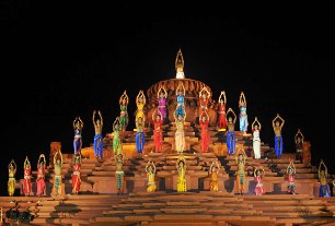 In Modhera too, as in Kashmir, the representation of the Sun God seems to indicate a foreign model for the figure is clothed for cold weather in boots and cloak, unfamiliar to Gujarat. However, the main idol, and his sunken garba griha, are lost to us forever. It is fortunate that his chariot pulled by seven horses was drawn from the rubble around the temple before it could be further ruined. Although the temple’s shikhar is missing, the spires of the small ‘kund’ temples are an indication of what it might have looked like. Even though probably more curvilinear than those of Konark or Khajuraho, Modhera’s spire followed the basic Nagara pattern of vertical lines meeting at a point directly above the garba griha. In front of the temple is a colossal tank, which was once known as Surya Kund or Rama Kund .The tank has a series of carved steps leading to the bottom. Several miniature shrines adorn the steps of the tank – which is an art gallery in itself. Modhera is now the site of several dance and cultural festivals. The sun temple and the ambience here provide a majestic backdrop for the exhibition of performing arts.